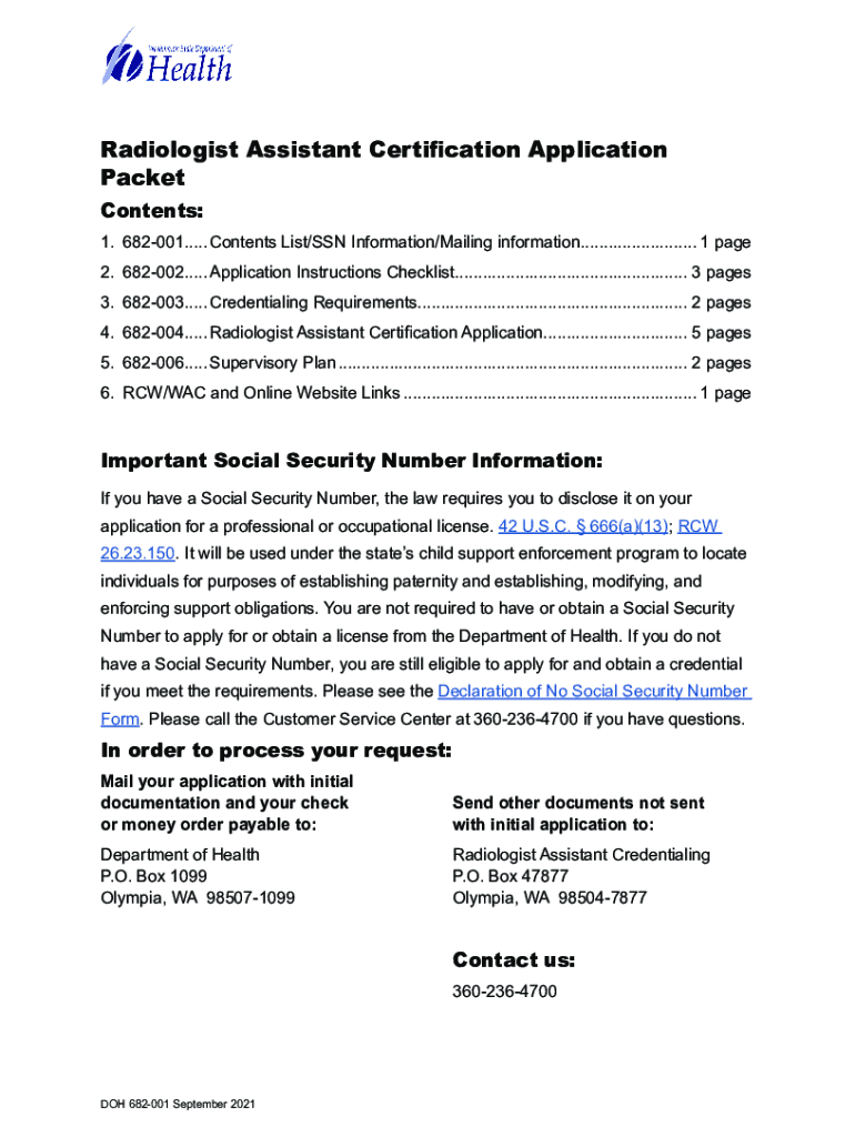 Radiologist Assistant Certification Application Packet Contents: 1. 682001..... Contents List/SSN Information/Mailing information......................... 1 page 2. 682002..... Application Instructions