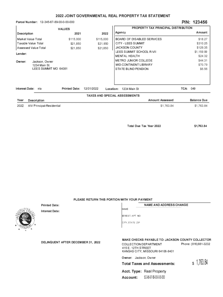 2022 JOINT GOVERNMENTAL REAL PROPERTY TAX STATEMENT PIN: 123456Parcel Number: 12345678900000000PROPERTY TAX PRINCIPAL DISTRIBUTIONVALUES Description Market Value Total Taxable Value Total Assessed