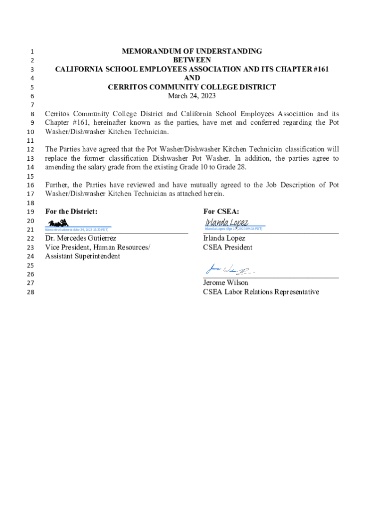 1 2 3 4 5 6 7 8 9 10 11 12 13 14 15 16 17 18 19 20 21 22 23 24 25 26 27 28MEMORANDUM OF UNDERSTANDING BETWEEN CALIFORNIA SCHOOL EMPLOYEES ASSOCIATION AND ITS CHAPTER #161 AND BURRITOS COMMUNITY COLLEGE