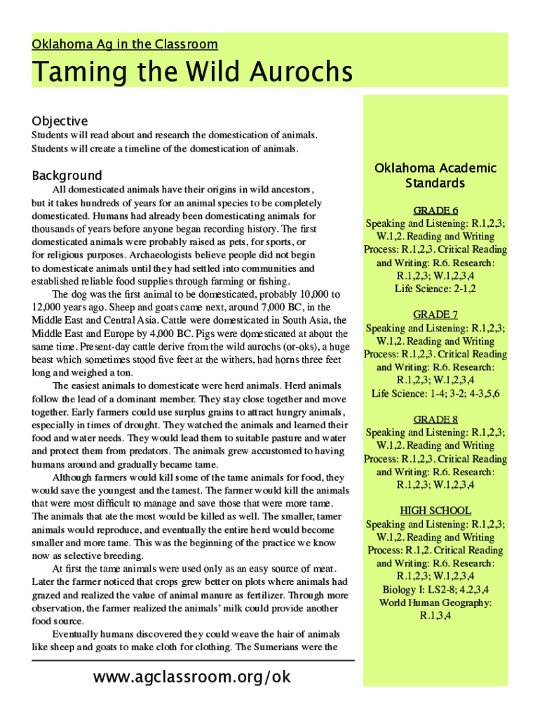 Oklahoma Ag in the ClassroomTaming the Wild Aurochs ObjectiveStudents will read about and research the domestication of animals. Students will create a timeline of the domestication of animals. Background