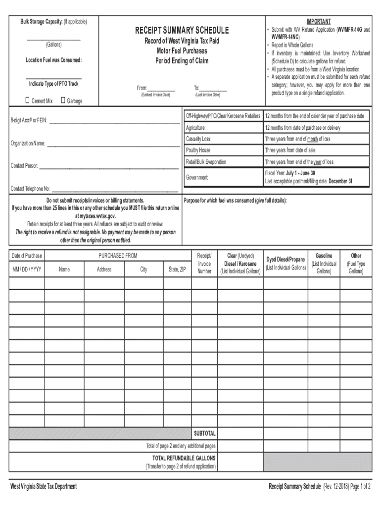 Bulk Storage Capacity: (If applicable)RECEIPT SUMMARY SCHEDULE___ (Gallons)Record of West Virginia Tax Paid Motor Fuel Purchases Period Ending of ClaimLocation Fuel was Consumed: ___ Indicate Type