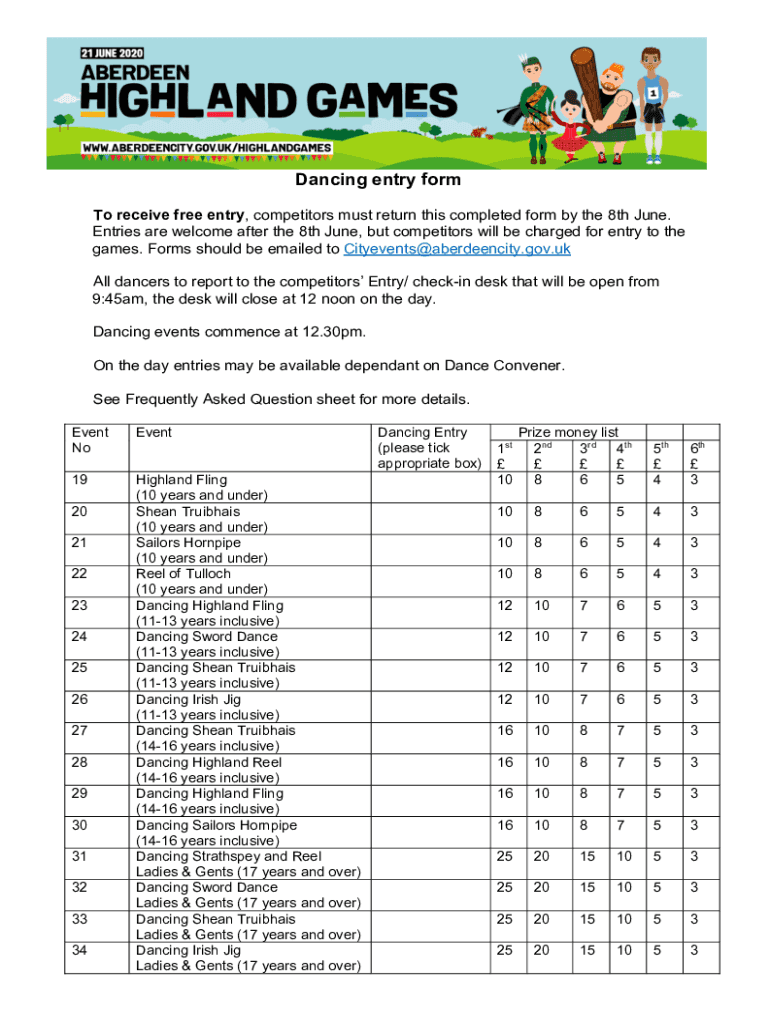 Dancing entry form To receive free entry, competitors must return this completed form by the 8th June. Entries are welcome after the 8th June, but competitors will be charged for entry to the games.