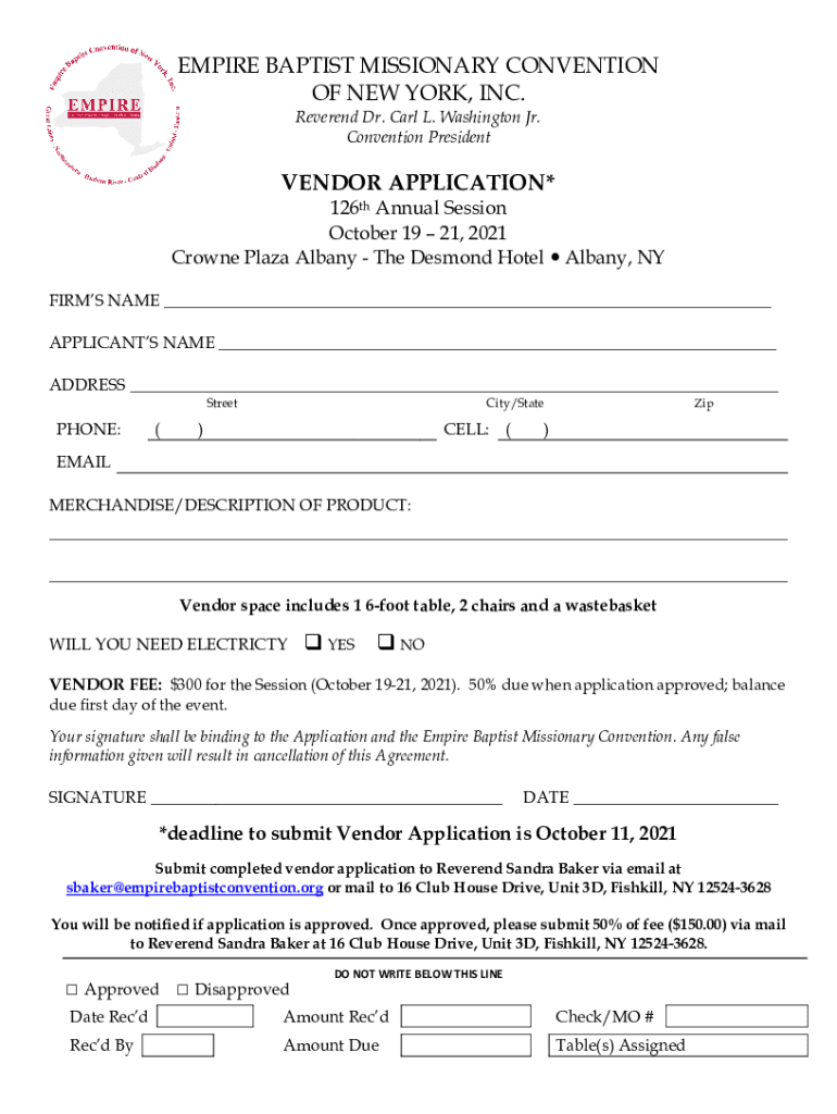 EMPIRE BAPTIST MISSIONARY CONVENTION OF NEW YORK, INC. Reverend Dr. Carl L. Washington Jr. Convention PresidentVENDOR APPLICATION* 126th Annual Session October 19 21, 2021 Crown Plaza Albany The Desmond