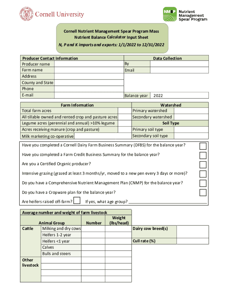 Cornell Nutrient Management Spear Program Mass Nutrient Balance Calculator Input Sheet N, P and K imports and exports: 1/1/2022 to 12/31/2022 Producer Contact Information Producer name Farm name Address