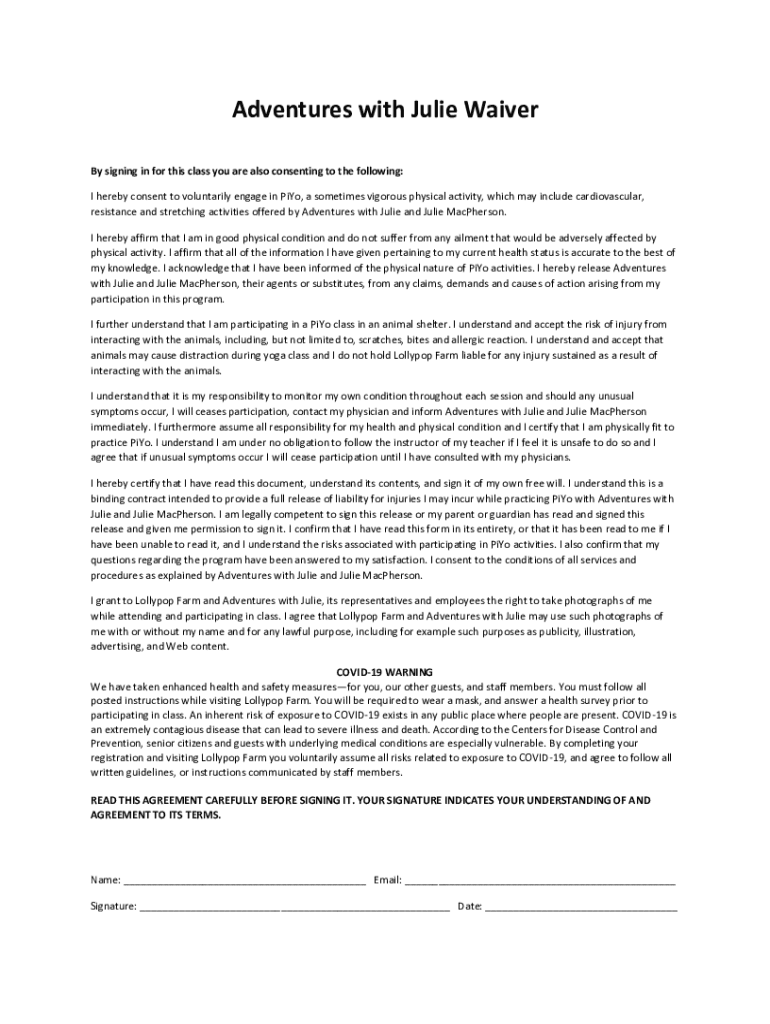 Adventures with Julie Waiver By signing in for this class you are also consenting to the following: I hereby consent to voluntarily engage in PICO, a sometimes vigorous physical activity, which may