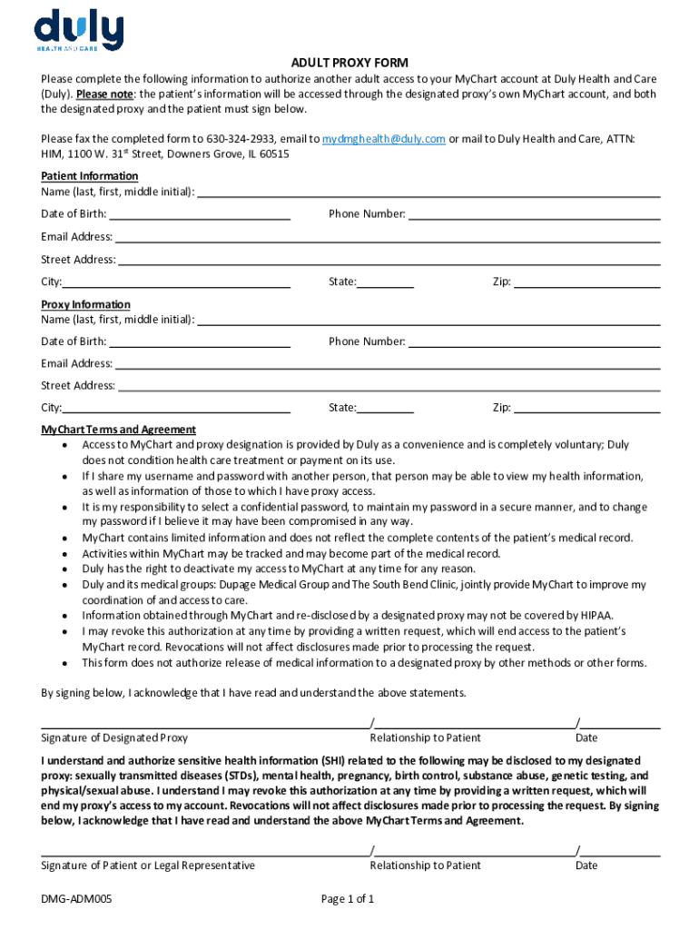 ADULT PROXY Formulas complete the following information to authorize another adult access to your Chart account at Duly Health and Care (Duly). Please note: the patients' information will be accessed
