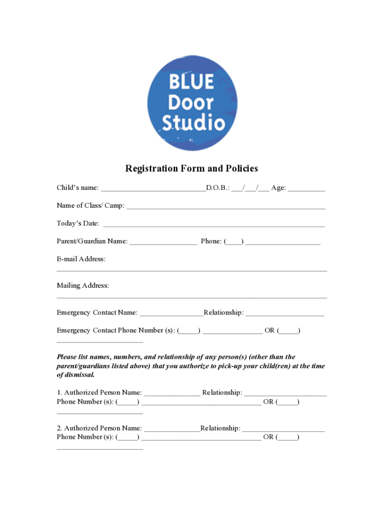 Registration Form and Policies Child's name: ___D. O.B.: ___/___/___ Age: ___ Name of Class/ Camp: ___ Today's Date: ___ Parent/Guardian Name: ___ Phone: (___) ___ Email Address: ___ Mailing Address:
