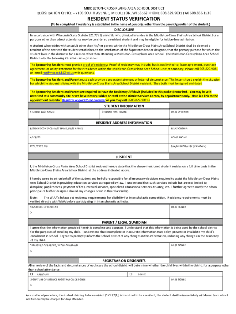 MIDDLETONCROSS PLAINS AREA SCHOOL DISTRICT REGISTRATION OFFICE 7106 SOUTH AVENUE, MIDDLETON, WI 53562 PHONE 608.829.9031 FAX 608.836.1536RESIDENT STATUS VERIFICATION(To be completed if residency is