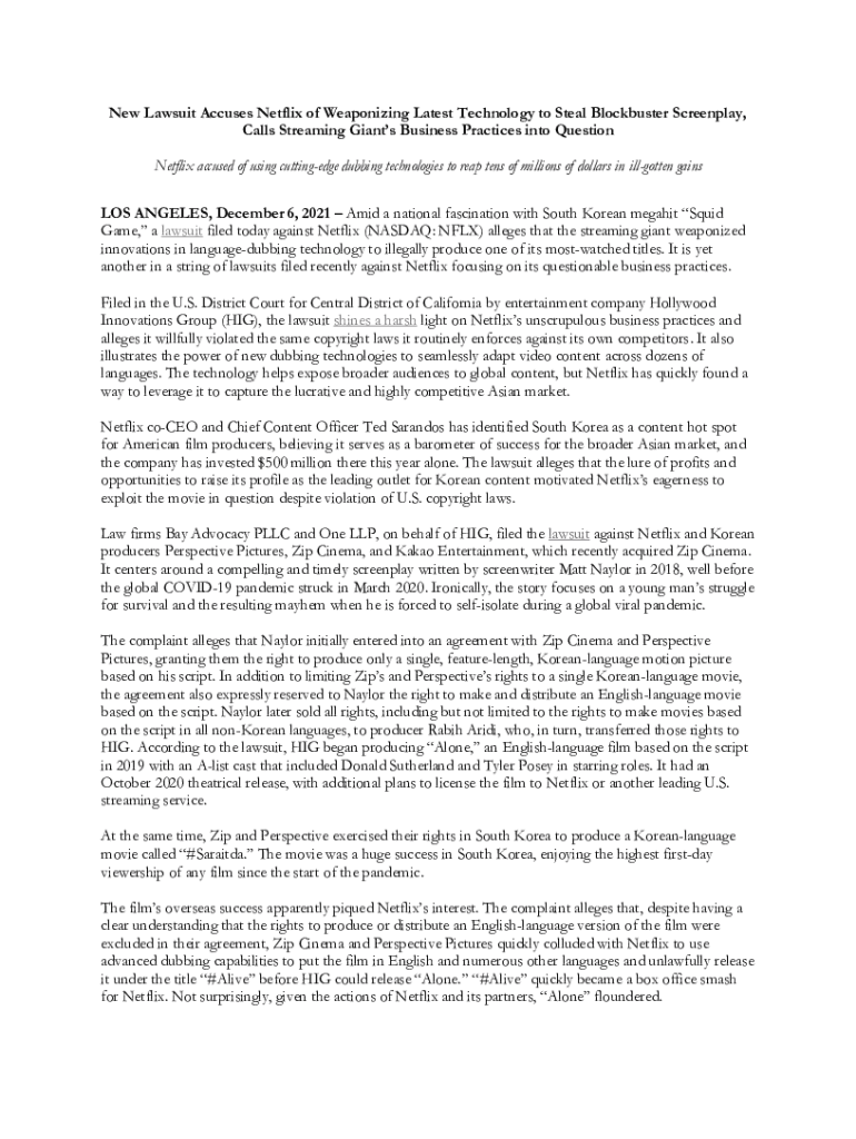 New Lawsuit Accuses Netflix of Weaponizing The Latest Technology to Steal Blockbuster Screenplay, Calls Streaming Giants Business Practices into Question Netflix accused of using cutting edge dubbing