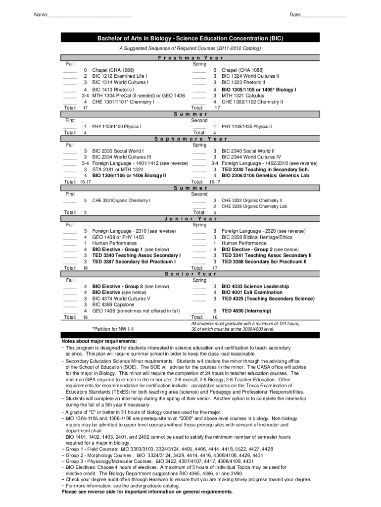 Name:___Date:___Bachelor of Arts in Biology Science Education Concentration (BIC) A Suggested Sequence of Required Courses (20112012 Catalog) Fall ___ ___ ___ ___ ___ ___ Total: First ___ Total:0