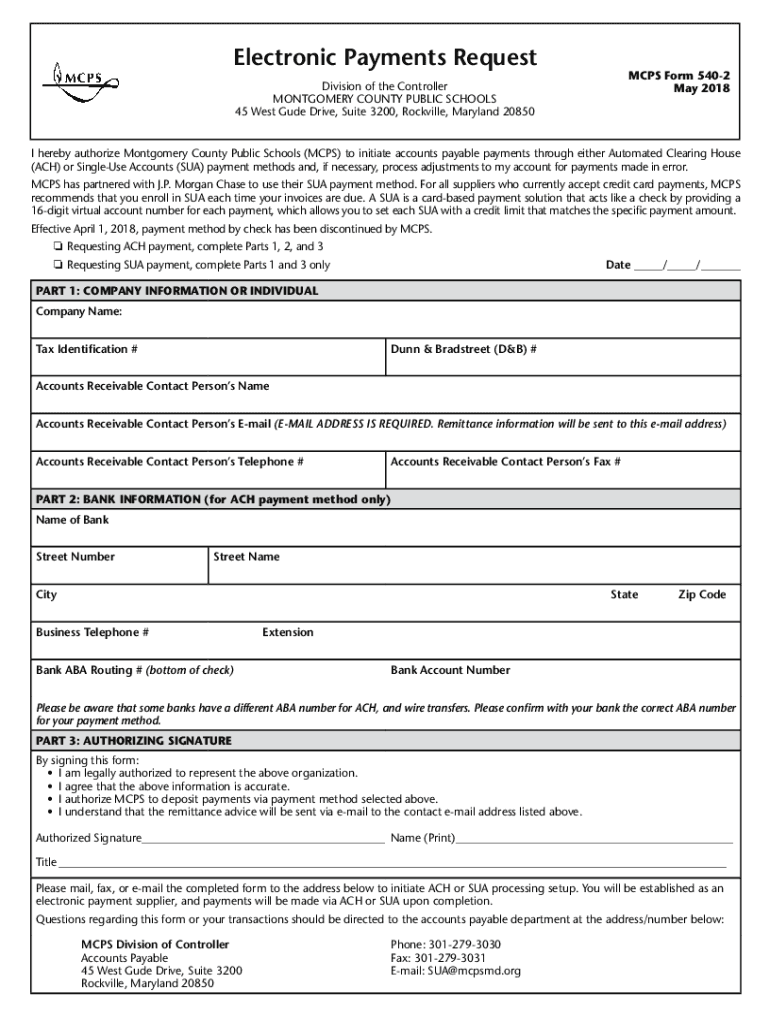 Electronic Payments Requests Form 5402 May 2018Division of the Controller MONTGOMERY COUNTY PUBLIC SCHOOLS 45 West Guide Drive, Suite 3200, Rockville, Maryland 20850I hereby authorize Montgomery County