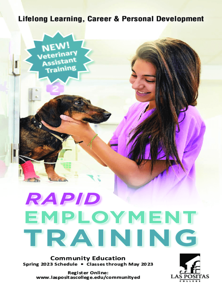 Lifelong Learning, Career & Personal DevelopmentNEWa!r veteran NT A assist g TraininRAPID EMPLOYMENTTRAINING Community EducationSpring 2023 Schedule Classes through May 2023 Register Online: www.laspositascollege.edu/communityedWelcome