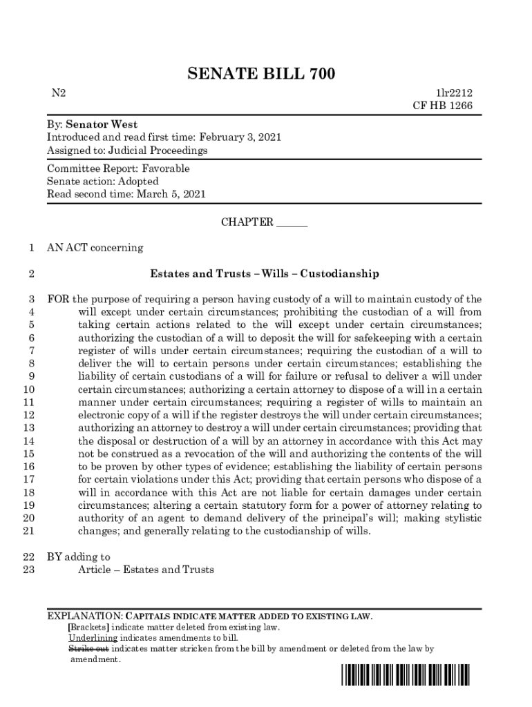 SENATE BILL 700 N21lr2212 CF HE 1266By: Senator West Introduced and read first time: February 3, 2021, Assigned to: Judicial Proceedings Committee Report: Favorable Senate action: Adopted Read second