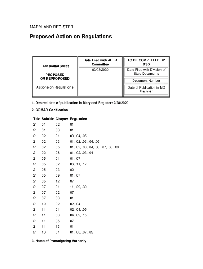 MARYLAND REGISTERProposed Action on RegulationsTransmittal Sedate Filed with AEL