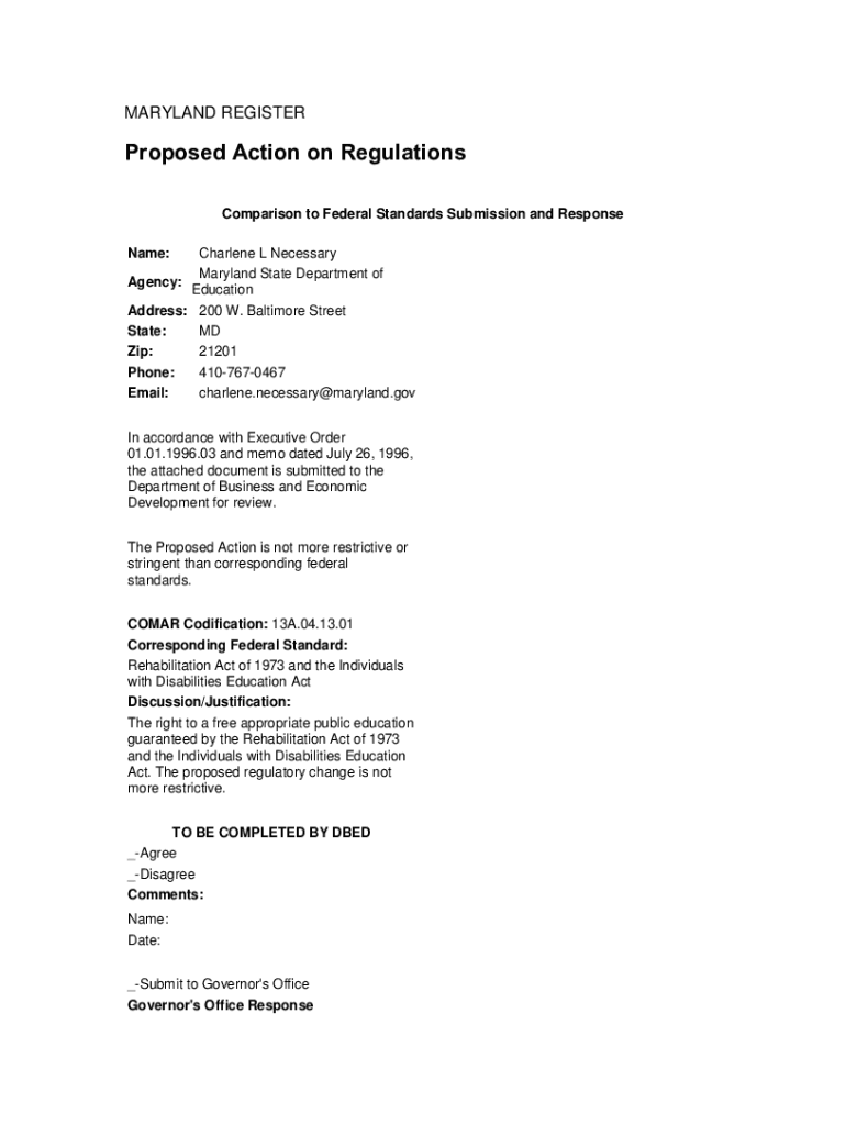 MARYLAND REGISTERProposed Action on Regulations Comparison to Federal Standards Submission and Response Name:Charlene L Necessary Maryland State Department of Agency: Education Address: 200 W. Baltimore