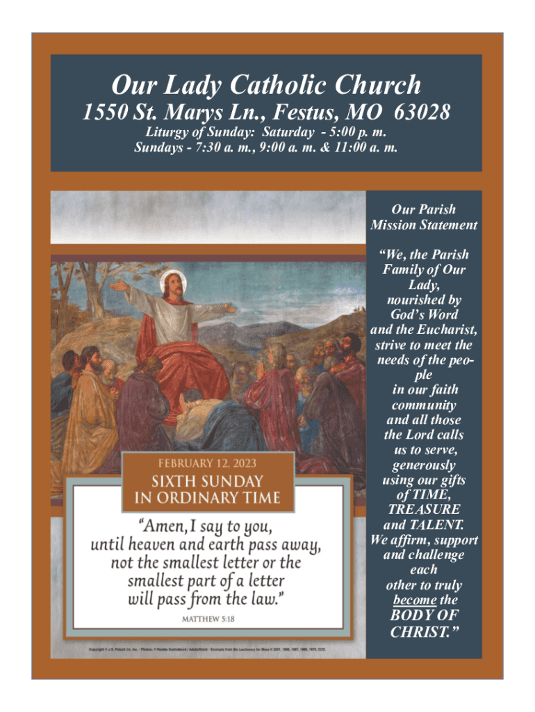 Our Lady Catholic Church1550 St. Mary's Ln., Fests, MO 63028 Liturgy of Sunday: Saturday 5:00 p. m. Sundays 7:30 a. m., 9:00 a. m. & 11:00 a. m. Our Parish Mission Statement We, the Parish Family