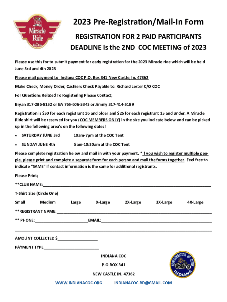 2023 Preregistration/Mailing Form REGISTRATION FOR 2 PAID PARTICIPANTS DEADLINE is the 2ND COC MEETING of 2023 Please use this for to submit payment for early registration for the 2023 Miracle ride