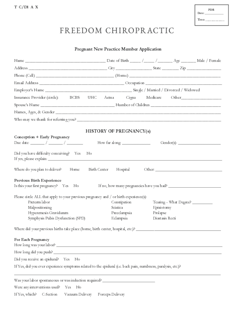 T C/D1 A APDR Date: ___ Time: ___Pregnant New Practice Member Application Name ___ Date of Birth ___ /___ /___ Age ___ Male / Female Address ___ City ___ State ___ Zip ___ Phone (Cell) ___ (Home)