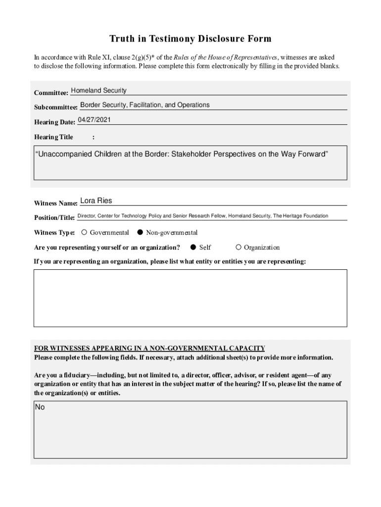 Truth in Testimony Disclosure Form In accordance with Rule XI, clause 2(g)(5)* of the Rules of the House of Representatives, witnesses are asked to disclose the following information. Please complete