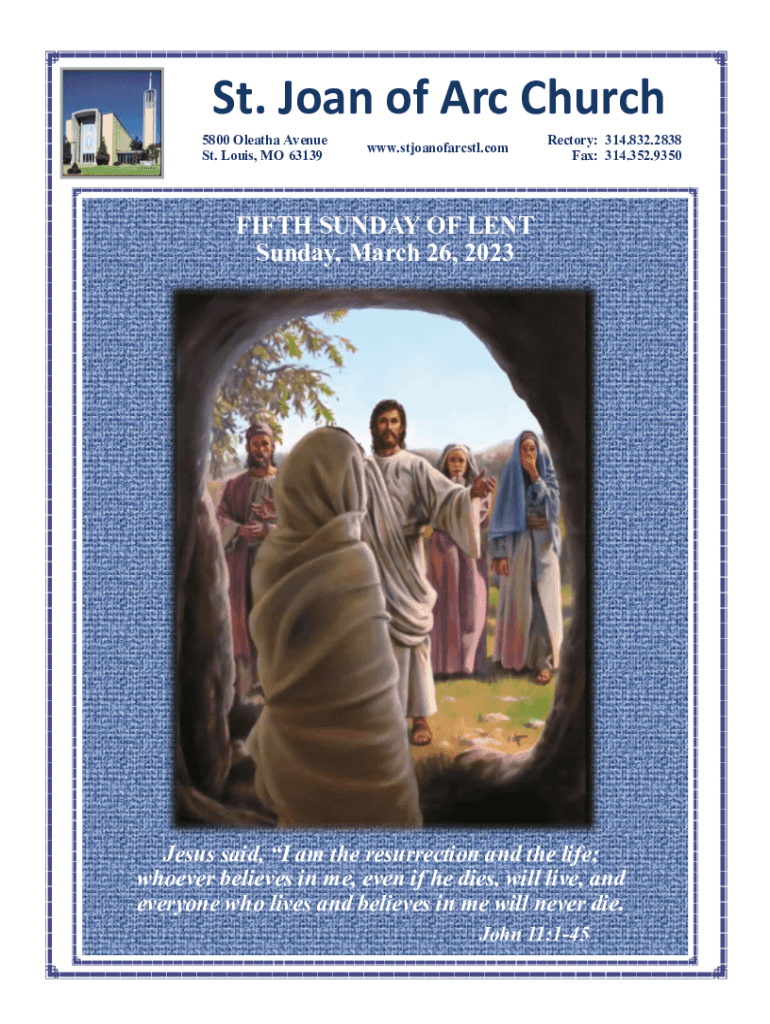 FIFTH SUNDAY OF PETRARCH 26, 2023St. Joan of Arc Church 5800 Letha Avenue St. Louis, MO 63139www.stjoanofarcstl.corrector: 314.832.2838 Fax: 314.352.9350FIFTH SUNDAY OF LENT Sunday, March 26, 2023Borrowed