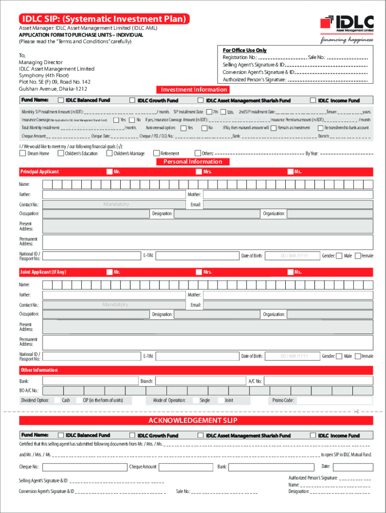 IDLE SIP: (Systematic Investment Plan) Asset Manager: IDLE Asset Management Limited (IDLE AML) APPLICATION FORM TO PURCHASE UNITS INDIVIDUAL (Please read the Terms and Conditions carefully) For Office