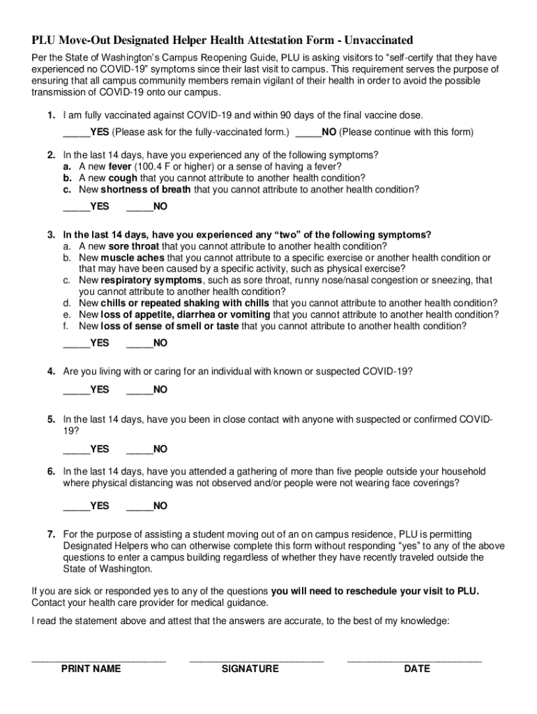 PLU Move Designated Helper Health Attestation Form Unvaccinated Per the State of Washington's Campus Reopening Guide, PLU is asking visitors to self certify that they have experienced no COVID-19