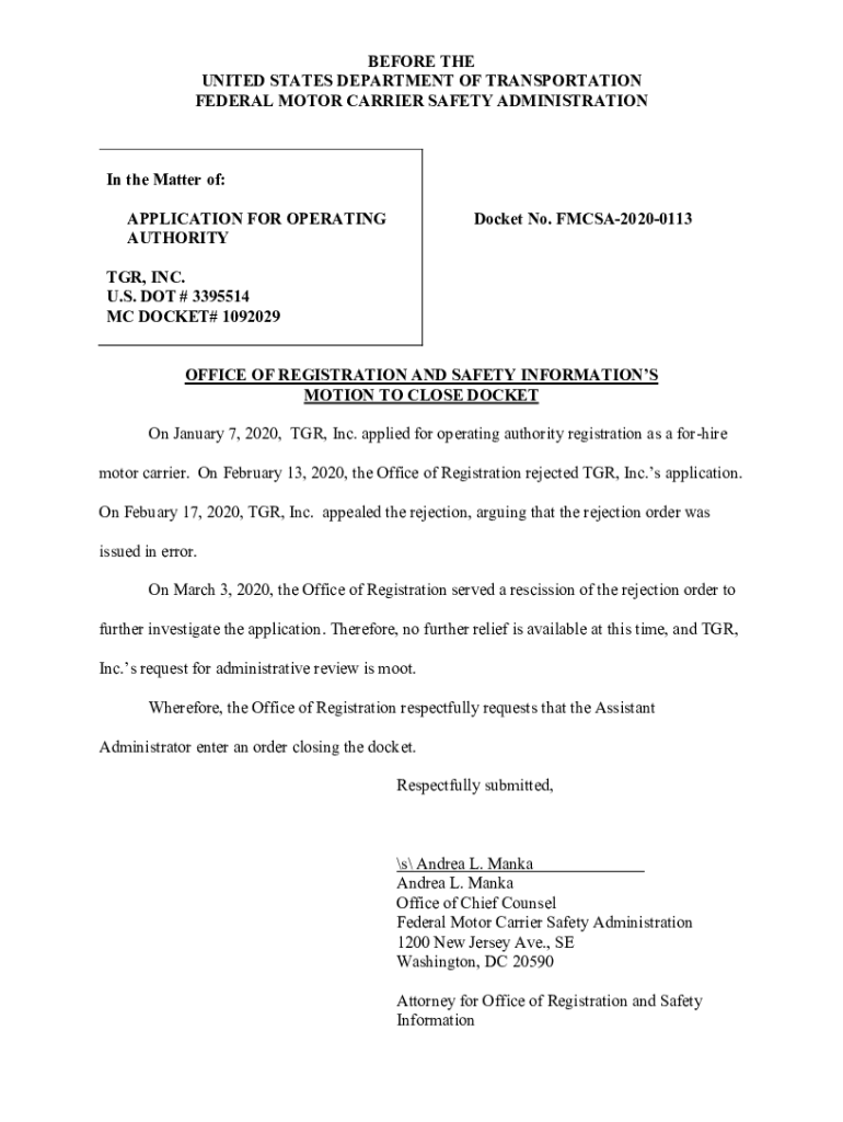 BEFORE THE UNITED STATES DEPARTMENT OF TRANSPORTATION FEDERAL MOTOR CARRIER SAFETY ADMINISTRATION In the Matter of: APPLICATION FOR OPERATING AUTHORITYDocket No. FMCSA20200113TGR, INC. U.S. DOT #