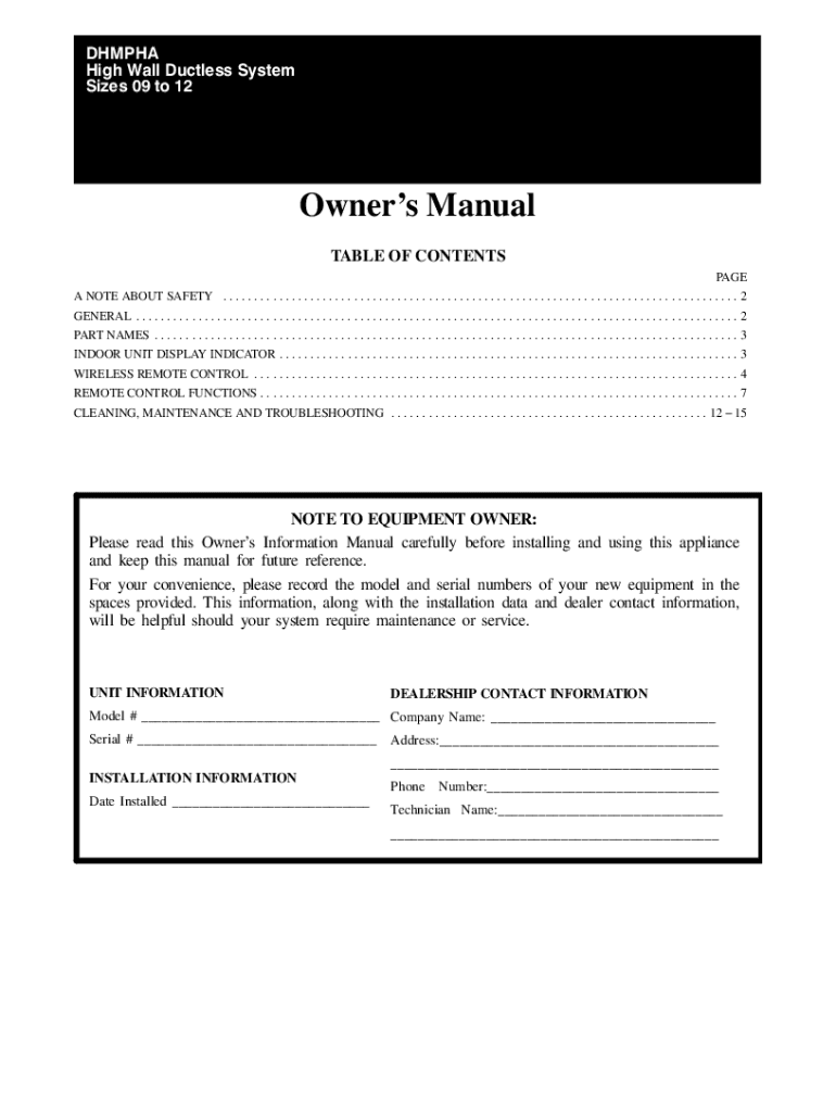 Get the free DLFSHA OWNER'S MANUAL High Wall Ductless System