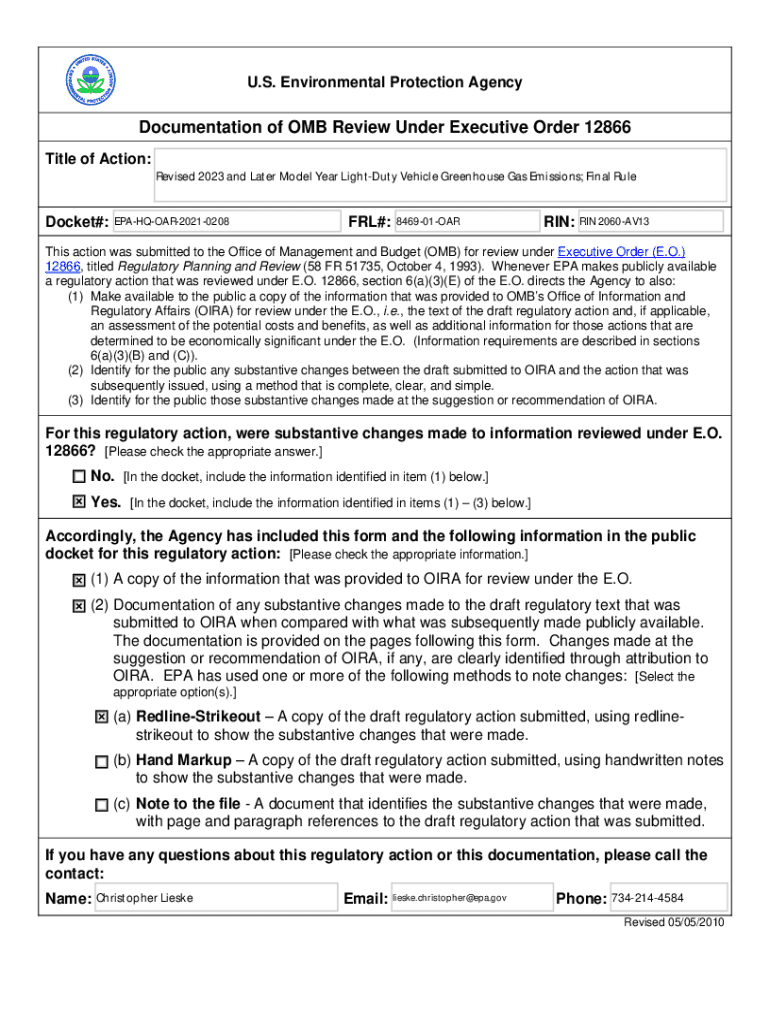 U.S. Environmental Protection AgencyDocumentation of OMB Review Under Executive Order 12866 Title of Action: Revised 2023 and Later Model Year Lightly Vehicle Greenhouse Gas Emissions; Final RuleDocket#:EPAHQOAR20210208FRL#:846901OARRIN:IN