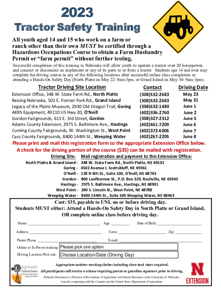 2023Tractor Safety Training All youth aged 14 and 15 who work on a farm or ranch other than their own MUST be certified through a Hazardous Occupations Course to obtain a Farm Husbandry Permit or