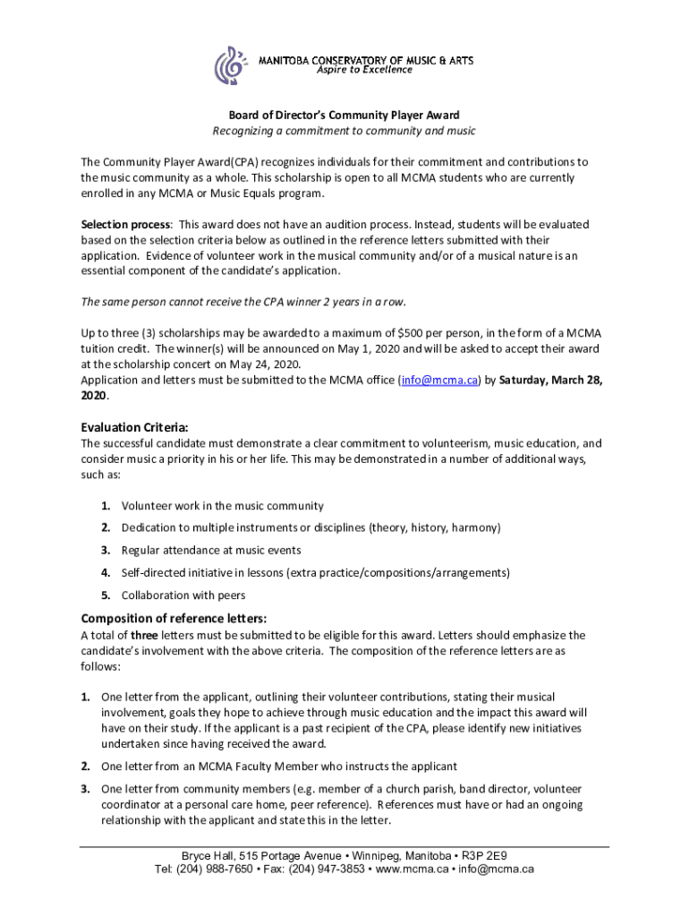Board of Directors Community Player Award Recognizing a commitment to community and music The Community Player Award(CPA) recognizes individuals for their commitment and contributions to the music