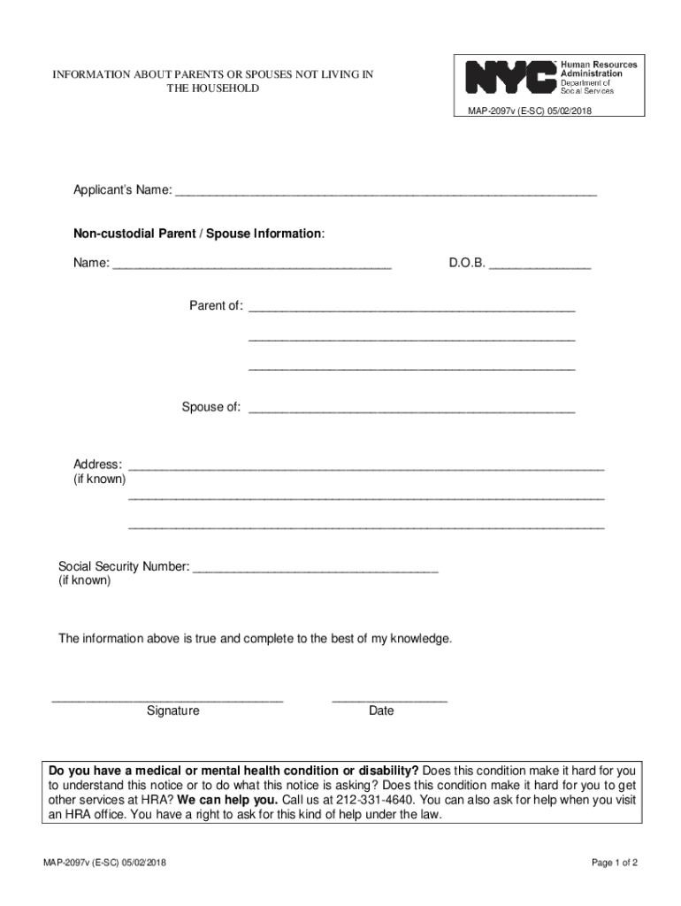 INFORMATION ABOUT PARENTS OR SPOUSES NOT LIVING IN THE HOUSEHOLD MAP2097v (ESC) 05/02/2018Applicants Name: ___ Noncustodial Parent / Spouse Information: Name: ___D. O.B. ___Parent of: ___ ___ ___Spouse