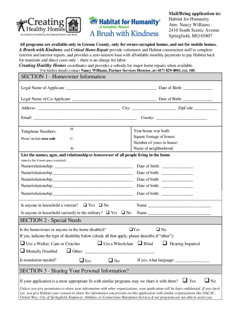 Mail/Bring application to: Habitat for Humanity Attn: Nancy Williams 2410 South Scenic Avenue Springfield, MO 65807 All programs are available only in Greene County, only for owner occupied homes,