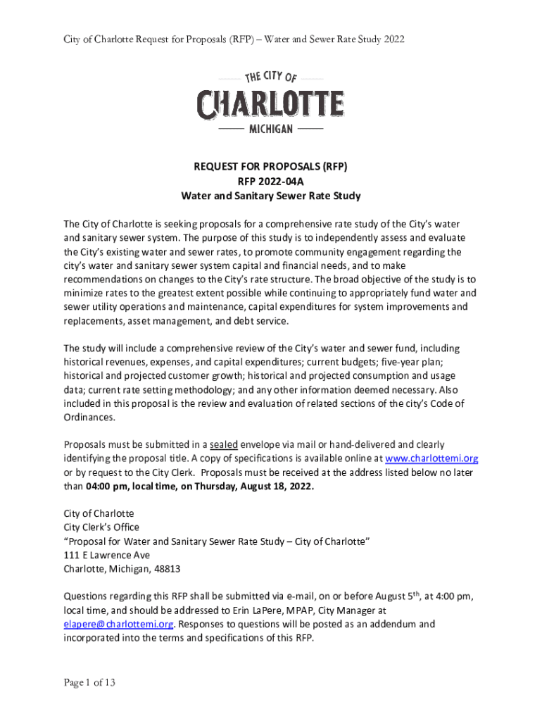 City of Charlotte Request for Proposals (RFP) Water and Sewer Rate Study 2022REQUEST FOR PROPOSALS (RFP) RFP 202204A Water and Sanitary Sewer Rate Study The City of Charlotte is seeking proposals