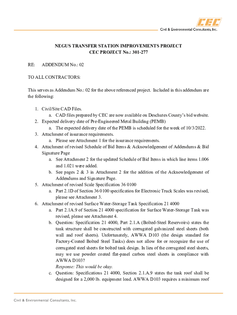 NEXUS TRANSFER STATION IMPROVEMENTS PROJECT CEC PROJECT No.: 301277 RE:ADDENDUM No.: 02TO ALL CONTRACTORS: This serves as Addendum No.: 02 for the above referenced project. Included in this addendum