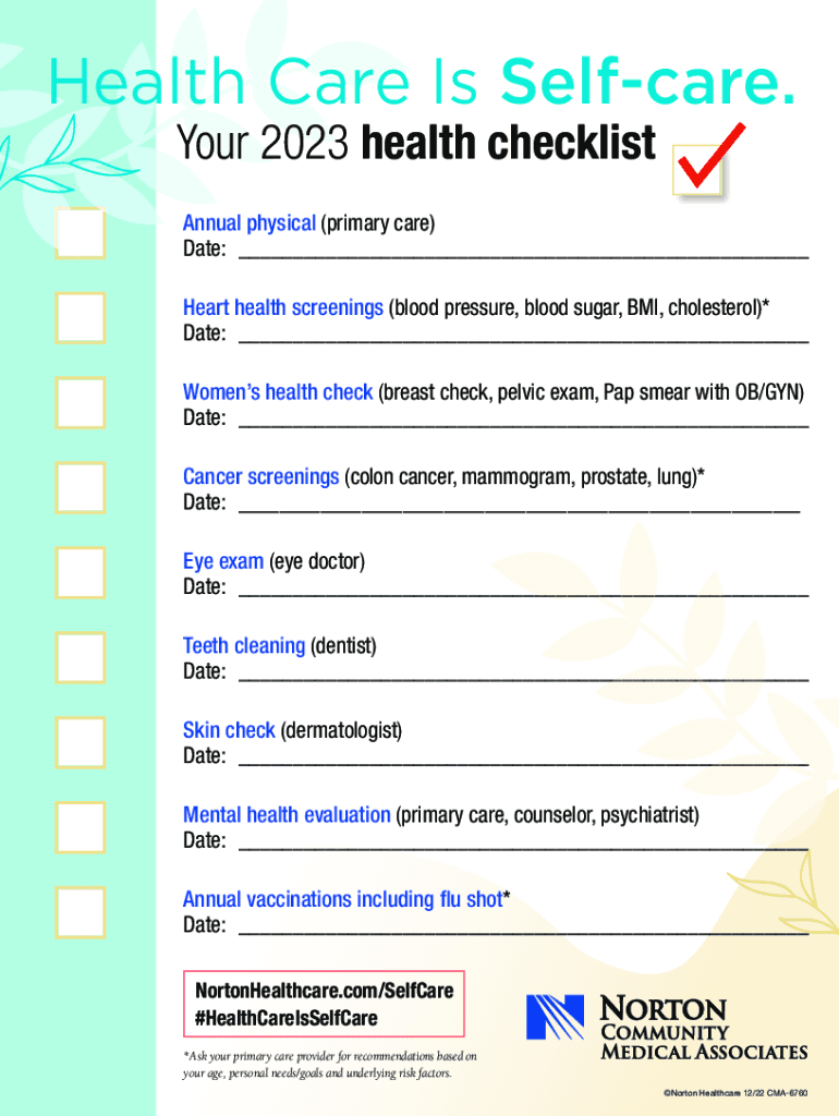 Health Care Is Self care. Your 2023 health checklistAnnual physical (primary care) Date: ___ Heart health screenings (blood pressure, blood sugar, BMI, cholesterol)* Date: ___Women's health check