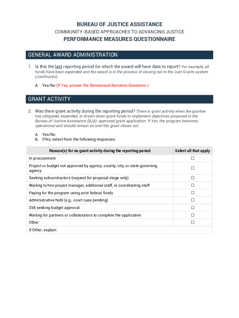 BUREAU OF JUSTICE ASSISTANCE COMMUNITYBASED APPROACHES TO ADVANCING JUSTICEPERFORMANCE MEASURES QUESTIONNAIRE GENERAL AWARD ADMINISTRATION 1. Is this the last reporting period for which the award