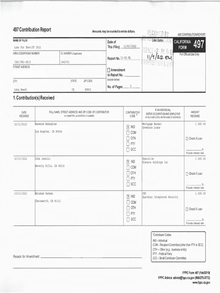 497 Contribution ReportAmounts may be rounded to whole dollars.NAME OF Filtrate of This Filing Luna for Sheriff 2022AREA CODE/PHONE NUMBER1.0. NUMBER (ii applicable)(562)9830815 STREET ADDRESS1442721CITY