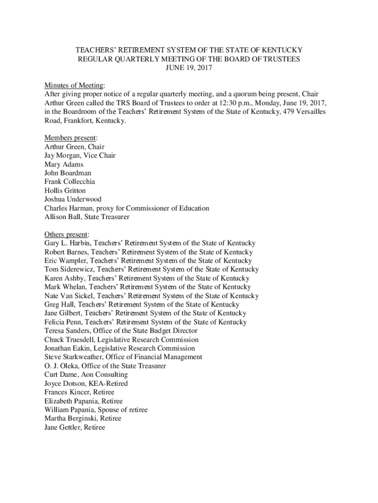 TEACHERS RETIREMENT SYSTEM OF THE STATE OF KENTUCKY REGULAR QUARTERLY MEETING OF THE BOARD OF TRUSTEES JUNE 19, 2017, Minutes of Meeting: After giving proper notice of a regular quarterly meeting,
