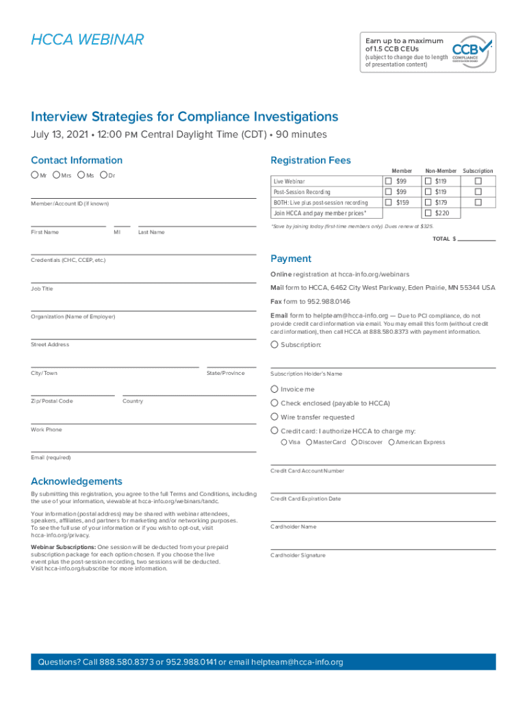 CCA WEBINAREarn up to a maximum of 1.5 CCB Zeus (subject to change due to length of presentation content)Interview Strategies for ComplianceInvestigations July 13, 2021 12:00 pm Central Daylight Time