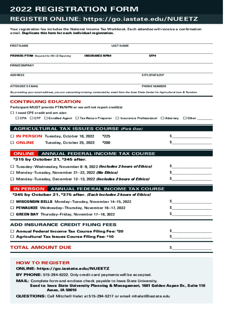 2022 REGISTRATION FORM REGISTER ONLINE: https://go.iastate.edu/NUEETZ Your registration fee includes the National Income Tax Workbook. Each attendee will receive a confirmation email. Duplicate this