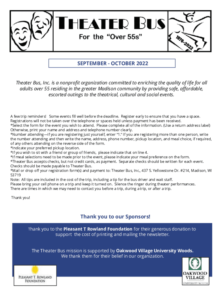 19762022SEPTEMBER OCTOBER 2022 Theater Bus, Inc. is a nonprofit organization committed to enriching the quality of life for all adults over 55 residing in the greater Madison community by providing