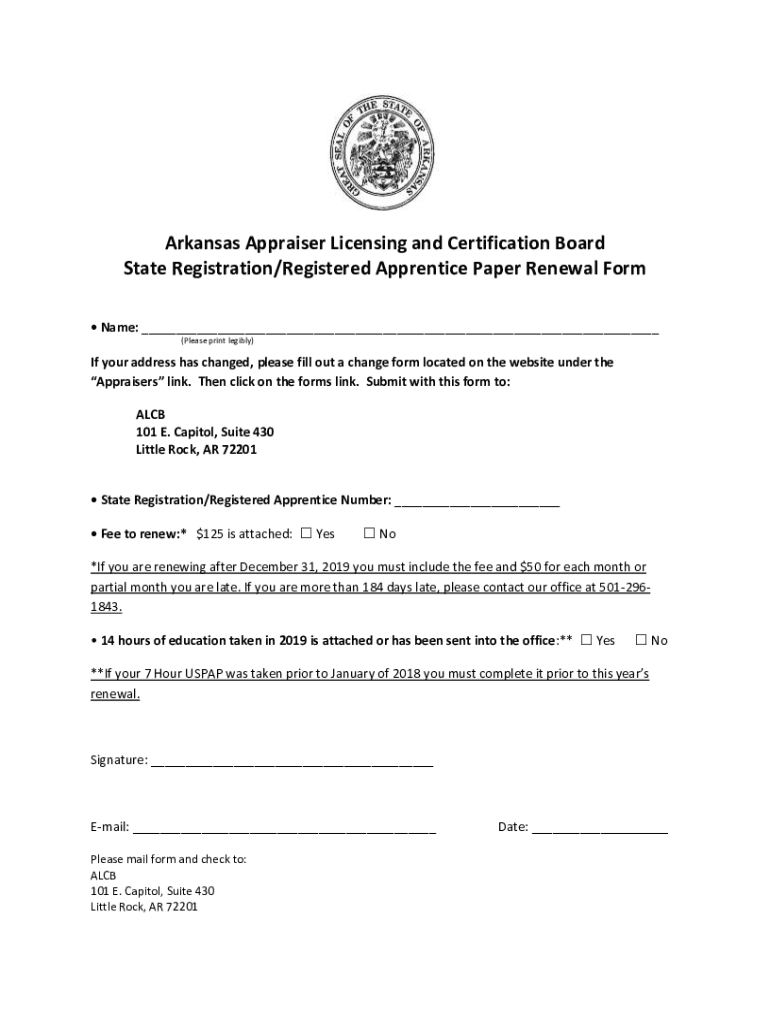 Arkansas Appraiser Licensing and Certification Board State Registration/Registered Apprentice Paper Renewal Form Name: ___ (Please print legibly)If your address has changed, please fill out a change
