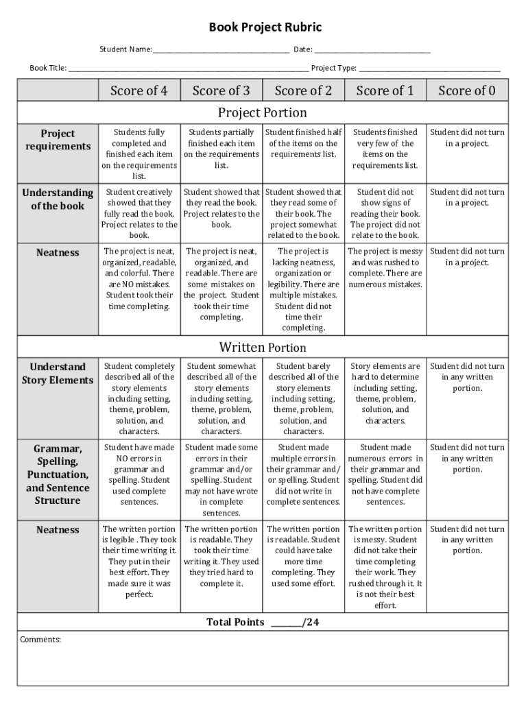 Book Project Rubric Student Name:___ Date: ___ Book Title: ___ Project Type: ___Score of 4Score of 3Score of 2Score of 1Score of 0Project Portion Project requirementsStudents fully Students partially