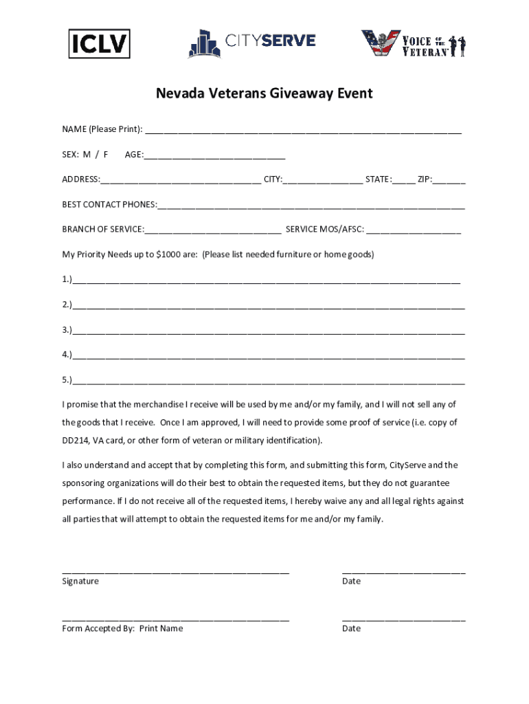 Nevada Veterans Giveaway Event NAME (Please Print): ___ SEX: M / FAGE:___ADDRESS:___ CITY:___ STATE:___ ZIP:___ BEST CONTACT PHONES:___ BRANCH OF SERVICE:___ SERVICE MOS/AFC: ___ My Priority Needs