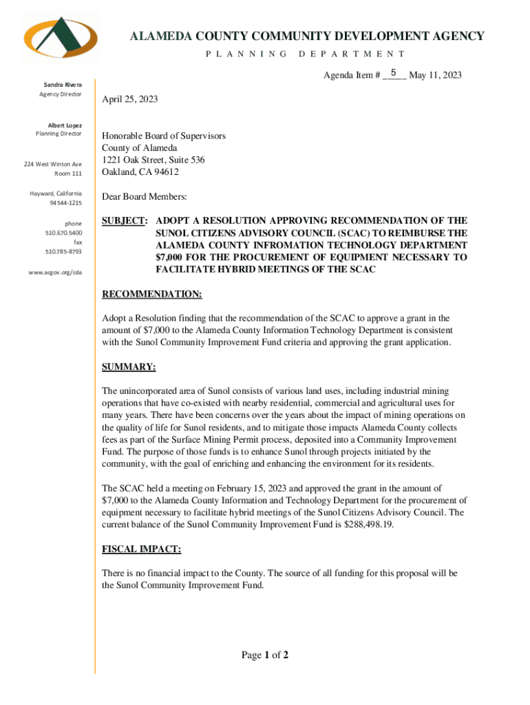 ALAMEDA COUNTY COMMUNITY DEVELOPMENT AGENCY P L A N N I N GD E P A R T M E N T5 May 11, 2023, Agenda Item # ___ Sandra Rivera Agency Director Albert Lopez Planning Director224 West Winston Ave Room