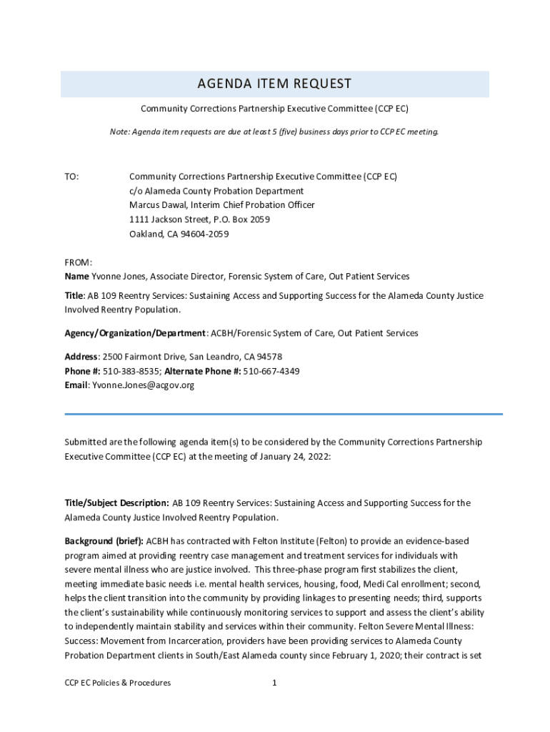 AGENDA ITEM REQUEST Community Corrections Partnership Executive Committee (CCP EC) Note: Agenda item requests are due at least 5 (five) business days prior to CCP EC meeting.TO:Community Corrections