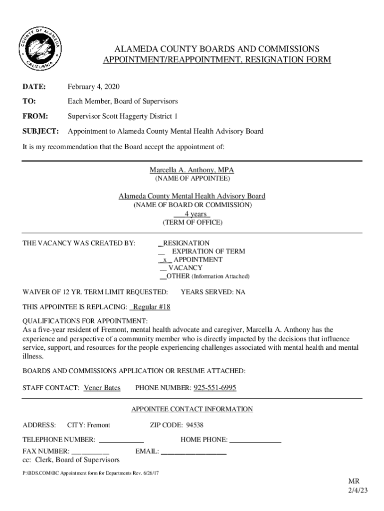 ALAMEDA COUNTY BOARDS AND COMMISSIONS APPOINTMENT/REAPPOINTMENT, RESIGNATION FORM DATE:February 4, 2020TO:Each Member, Board of SupervisorsFROM:Supervisor Scott Haggerty District 1SUBJECT:Appointment