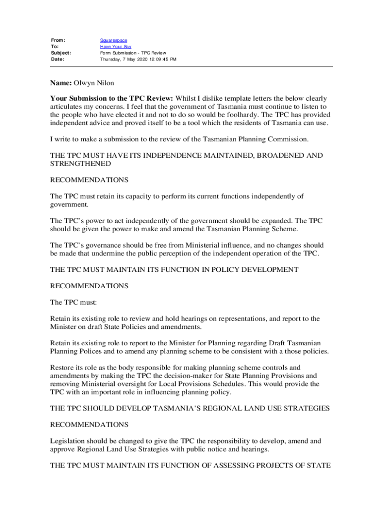 From: To: Subject: Date:Squarespace Have Your Say Form Submission TPC Review Thursday, 7 May 2020 12:09:45 Name: Own Nixon Your Submission to the TPC Review: Whilst I dislike template letters the