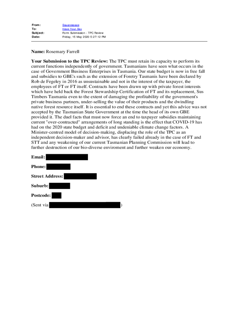 From: To: Subject: Date:Squarespace Have Your Say Form Submission TPC Review Friday, 15 May 2020 5:27:12 Name: Rosemary Farrell Your Submission to the TPC Review: The TPC must retain its capacity